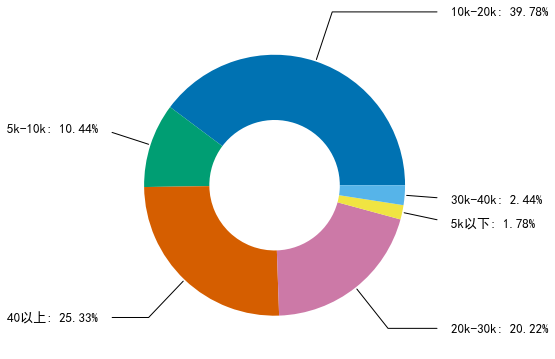 从上述两张图可以看到,学历要求和工作经验的值比较少且没有缺失值与异常值,可以直接进行分析;但薪资的分布比较多,总计有75种,为了更好地进行分析,我们要对薪资做一个预处理。根据其分布情况,可以将它分成【5k 以下、5k-10k、10k-20k、20k-30k、30k-40k、40k 以上】,为了更加方便我们分析,取每个薪资范围的中位数,并划分到我们指定的范围内。