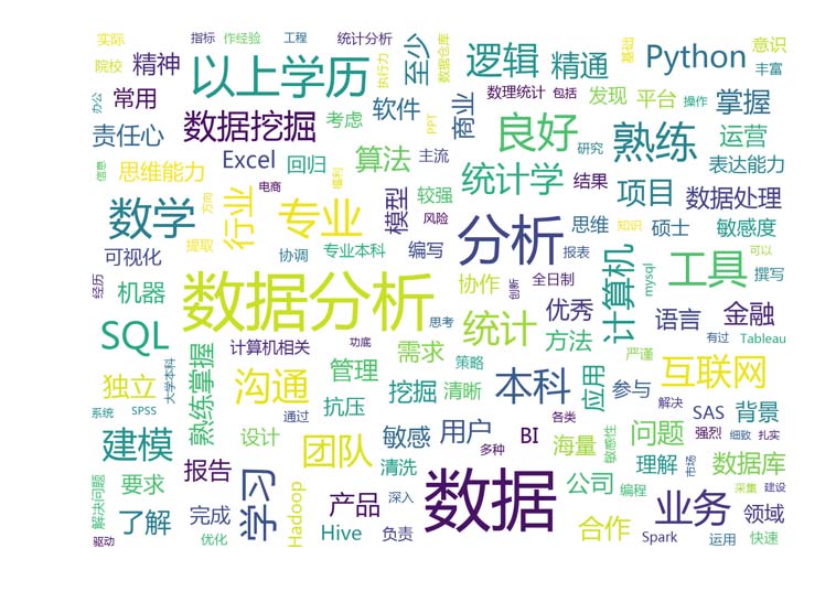 从词云图可看出,数据分析肯定要对数据比较敏感,并且对统计学、excel、python、数据挖掘、hadoop等也有一定的要求。不仅如此,还要求具有一定的抗压能力、解决问题的能力、良好的表达能力、思维能力等。