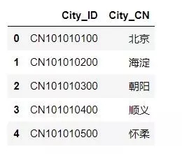 # 将下载好的文件命名为 'city_code.csv',并删除 header
