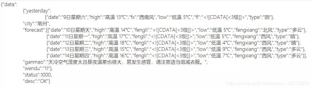 我们这次使用的 api 接口为:'http://wthrcdn.etouch.cn/weather_mini?citykey=[code]',code 就是之前处理过的城市代码,比如常州的城市代码为:101191101。替换掉变量 code ,网站返回给我们一段 json 格式的文件: