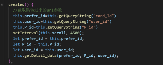 注释掉的部分是一开始我用params来传参的,这样就会出现我上面提到到在IOS上SPA页面不会刷新 url的问题,但是原生的window.location.href可以解决这个问题!!!这样在子页面我们在create生命周期去截取url中的字符串把需要的参数截取下来,赋值到data中去一样可以使用. 下面是子页面接收数据截取字符串(这里的截取字符串是直接复制找的,赶时间,你可以自己写,一次性截取3 个字符串)!!!