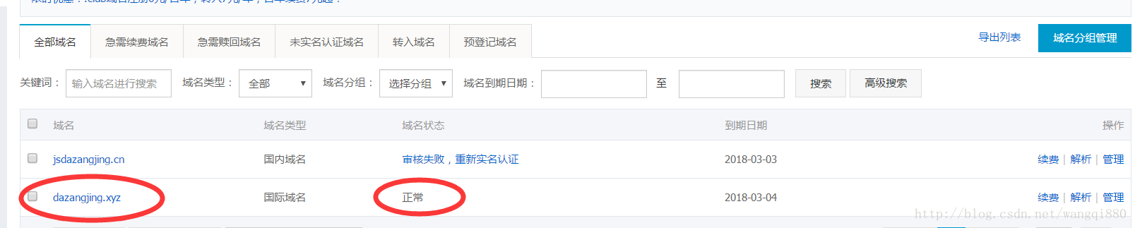 2)域名,这里是在阿里云平台上申请的,没有申请到cn,因为身份证信息和网上查询的有问题,我是转到学校的,所以没有审核通过。这里使用的是国际域名。通过审核才能用哈。