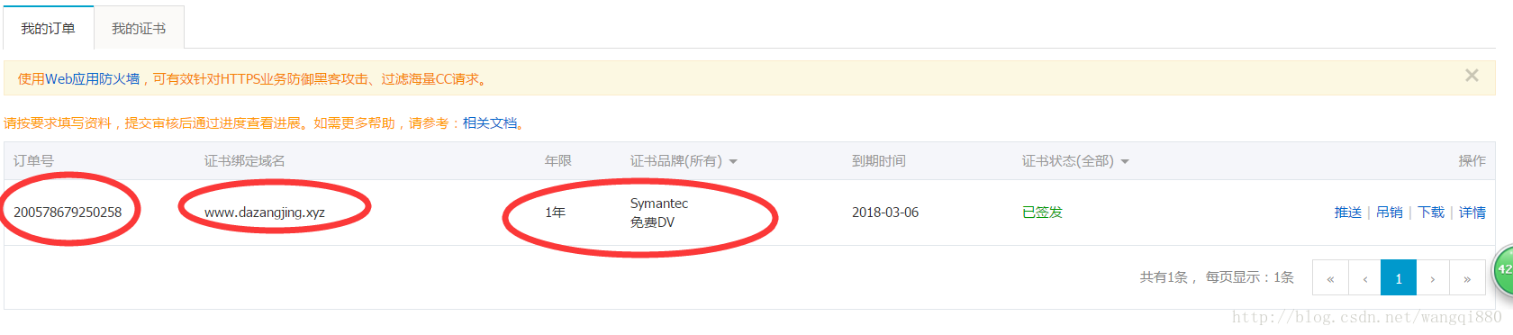 3)ac证书,这里也是在阿里云平台申请的,一年免费版,要绑定域名哈,这里直接使用最方便的针对tomcat的证书,人多的话就是用nginx哈。绑定了域名才能用哈。证书选择的时候,选择自动生成哈。按照步骤来就好了。