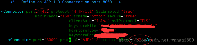 找到 Connector port=”8443” 标签,增加内容如下。证书密码,就上一步自己设置的