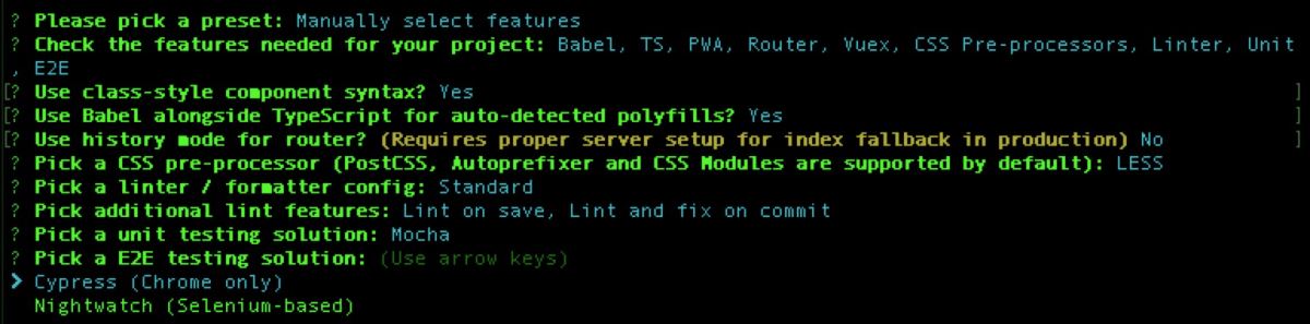 该配置项:选择端到端测试解决方案。选择nightwatch( 我也不懂,读者自行选择 )。