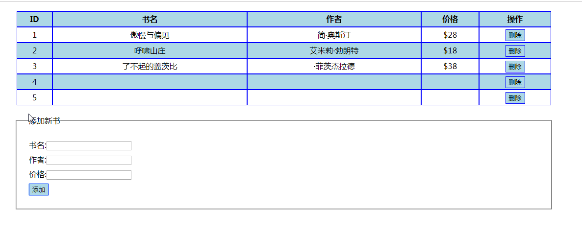 先放大图,当我们点击删除的时候,图书名单就会被我们删掉。当我们重新添加回来或者添加新书的时候,我们只需要在添加新书这里添加即可。