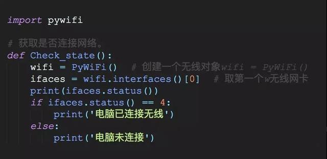 首先是创建一个pywifi的对象,然后将电脑无线网卡的信息赋值给ifaces。接着判断ifaces的状态(states)即可知道电脑是否连接无线网络。