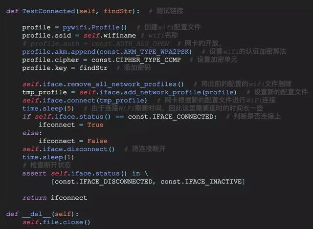 接下来,我们就要利用pywifi来进行破解WiFi密码的操作。我们仿照手动输入密码的过程,并进行验证,如果密码错误的话,我们就不停的更滑密码进行试验直到成功为止。部分的代码如下所示: