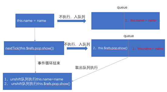 这句话就是说,当我们在父组件设置this.name=name的时候,vue并不会直接更新到子组件中(dom的更新也一样未立即执行),而是把这些更新操作全部放入到一个队列当中,同个组件的所有这些赋值操作,都作为一个watcher的更新操作放入这个队列当中,然后等到事件循环结束的时候,一次性从这个队列当中获取所有的wathcer执行更新操作。在我们这个例子当中,就是我们在调用show的时候,实际上,我们的this.name=name并未真正执行,而是被放入队列中。vue的这种做法是基于优化而做的,毋庸置疑,不然我们如果有n多个赋值vue就执行n多个dom更新,那效率将会非常的低效和不可取的。