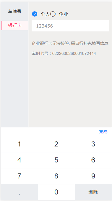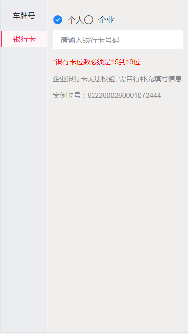 (注: 银行卡校验只能通过个人卡号的校验,企业卡号是无法校验,因为调用是支付宝校验的接口,企业只能做到校验号码位数)