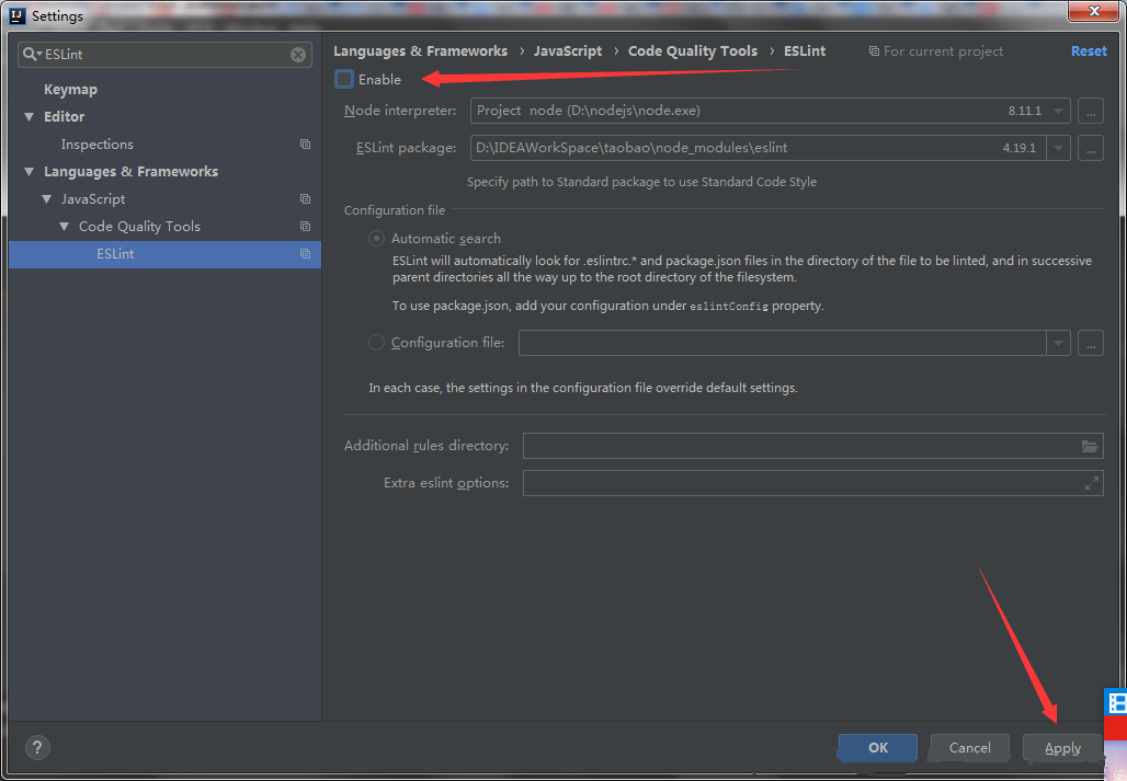 File>Settings>ESLint>取消检测即可(将Enable选项去勾选)>apply,如下图: