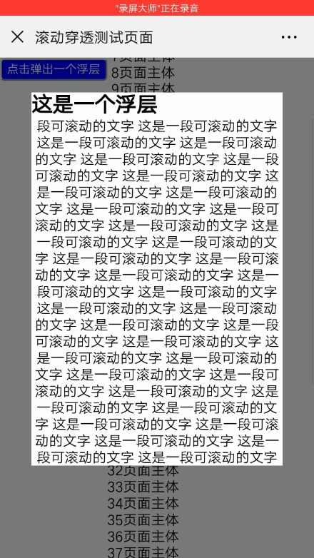 这个方案在ios中完美实现,但是在 android中还是有一点问题;浮层内容拉到最顶部或者最底部的时候依然会带动页面的内容有一定程度的移动。