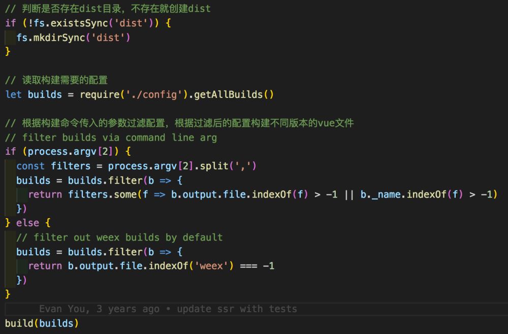 从代码可以看出,首先通过 script/config.js 文件的getAllBuilds方法获取配置,然后根据构建命令传入的参数对配置进行过滤,最后根据过滤后的配置执行build函数,编译出对应版本的vue文件。(这里介绍代码构建的过程,主要说明vue是怎么构建出不同版本代码的,build方法在此不做分析)
