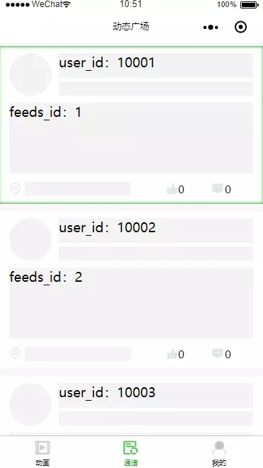 - 首先,进入动态广场页,请求加载数据,展示动态列表,其中,我们用绿色内阴影区分该条动态是“我的”,其他未加内阴影的表示是“别人的”;