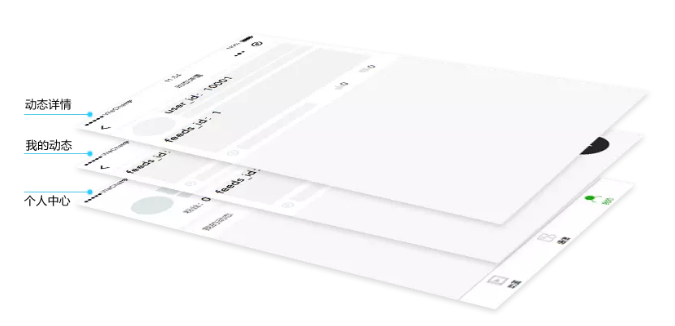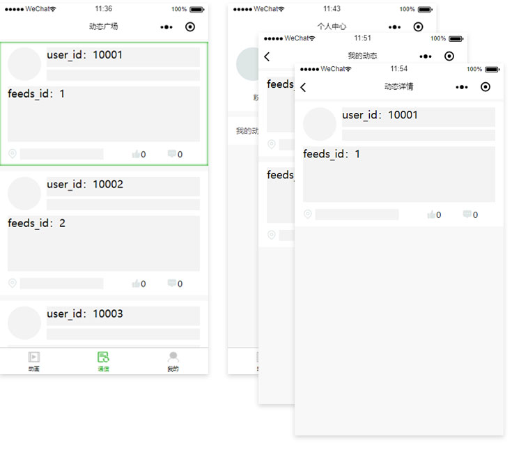 - 本场景包括4个页面:动态广场、个人中心、我的动态、动态详情