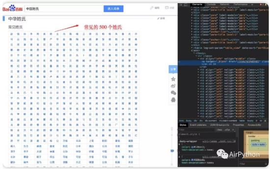 首先,我们需要爬取国内最常用的一些姓氏,以百度百科 - 中国姓氏为例。