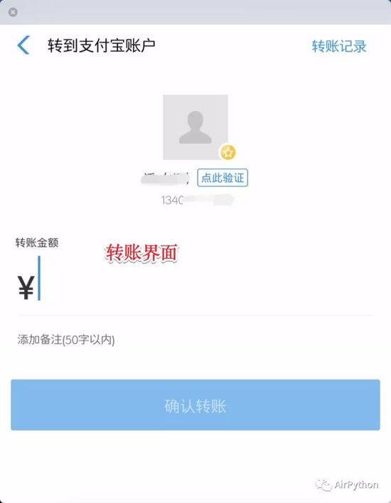 拿到常见的姓氏数据后,接着就使用自动化工具 Airtest 模拟打开支付宝 App,并一步步地跳转到转账界面