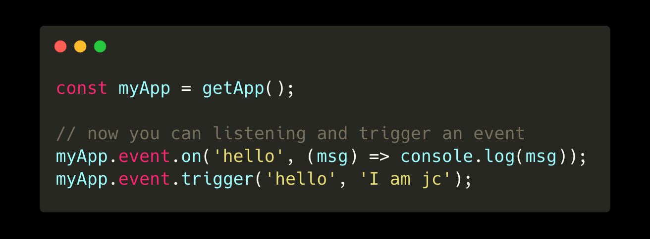 让插件能够给使用者提供 API。为了保证插件提供的 API 足够的优雅,支持当调用插件 API 的时候(如 event 插件 this.event.on(...) ),API 方法内部仍然能通过 this 获取到原生实例。