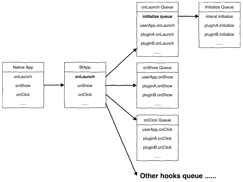 new BtApp(...)包装,所有的钩子函数,都会有一个独立的执行队列, - 首先会把原生的各个钩子函数