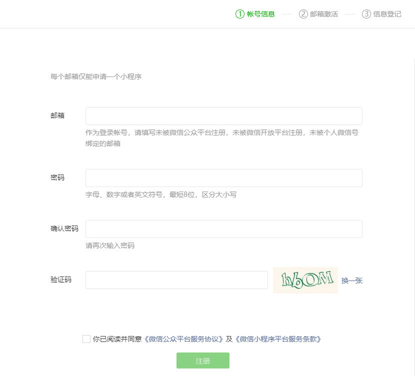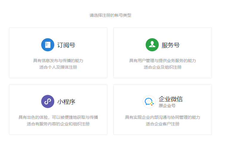 点击传送门立马注册微信小程序账号。点进去后会看到如下界面,选择注册类型时要选择微信小程序。