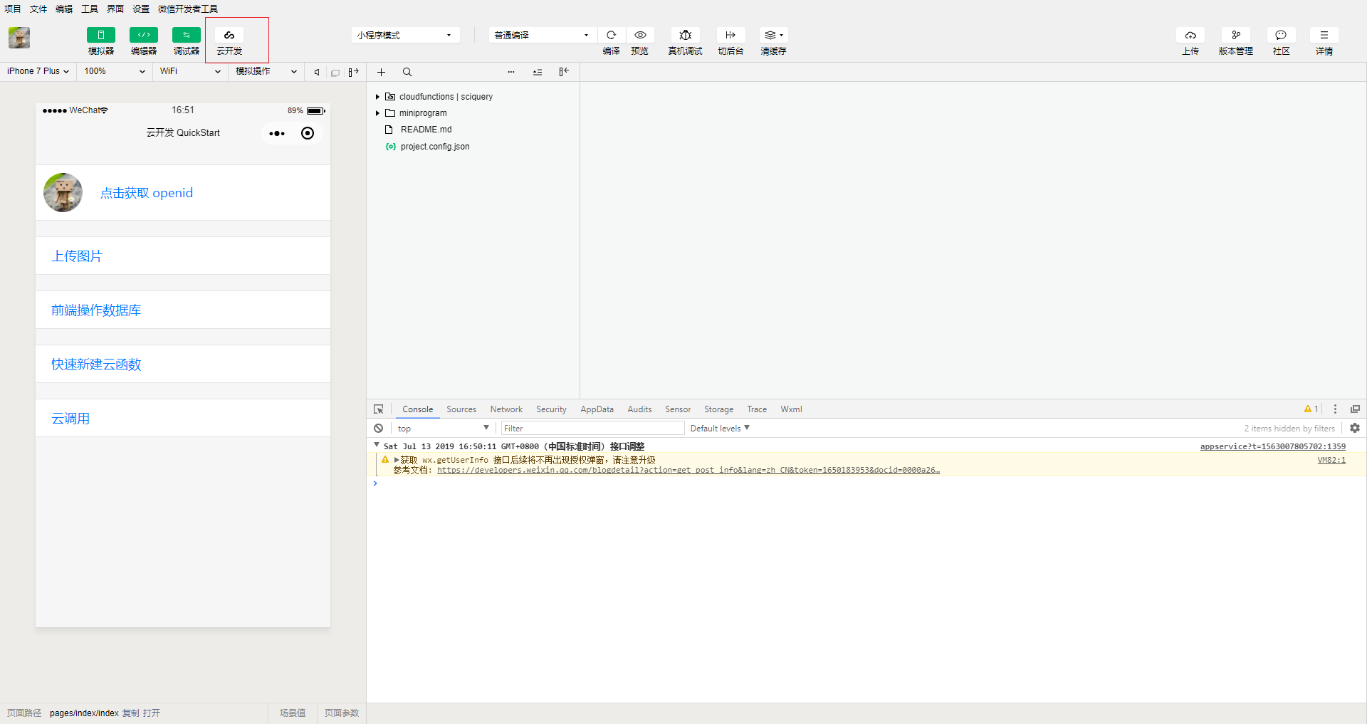 新建项目后我们可以看到,IDE已经帮我们新建了一个包含云函数开发的小程序模板,还提供了一些功能测试界面。 此时我们并没有开通云开发,需要点击IDE左上角的“云开发”,然后选择开通云服务。