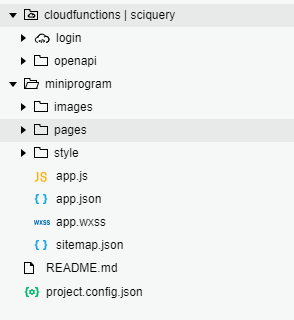 项目分为两个子文件夹,一个为cloudfunctions,里面包含小程序的云函数,一个子文件夹包含一个云函数;另一个为miniprogram,是小程序的前端文件夹,没有固定的文件夹格式,完全可以通过对app.json进行修改定制自己的文件夹。具体文件的介绍可以参考官方文档