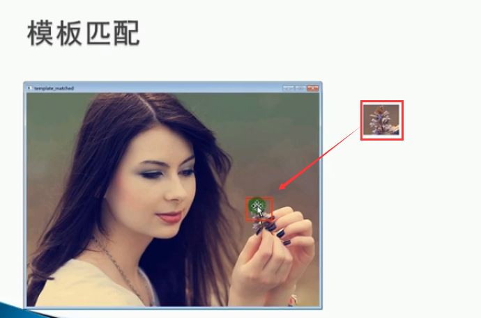 工作原理:在待检测图像上,从左到右,从上向下计算模板图像与重叠子图像的匹配度,匹配程度越大,两者相同的可能性越大。