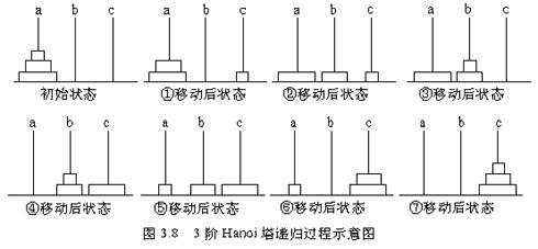 (3,A,B,C) ->move(2,A,C,B) ->move(1,A,B,C) A->C ->move(1,A,C,B) A->B ->move(1,C,A,B) C->B ->move(1,A,B,C) A->C ->move(2,B,A,C) ->move(1,B,C,A) B->A ->move(1,B,A,C) B->C ->move(1,A,B,C) A->C