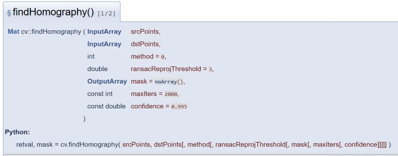 M, mask = cv2.findHomography(src_pts, dst_pts, cv2.RANSAC,5.0)