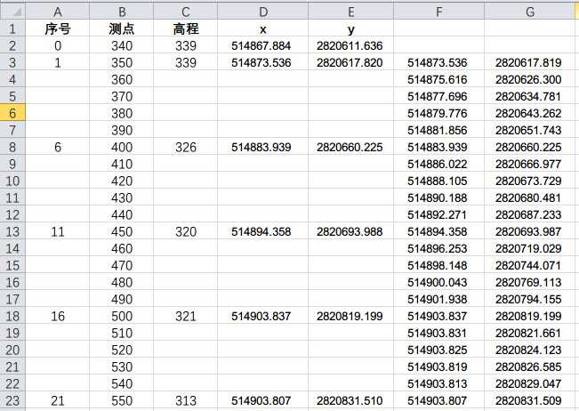 在野外布设700米的测线,点距为10米,用GPS每隔50米测量一个坐标,再把测线的头和为测量一个坐标。现在需使用线性插值的方法求取每两个坐标之间的其他4个点的值。