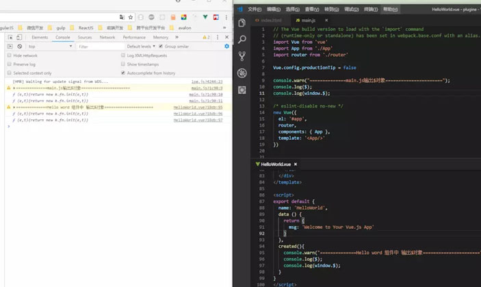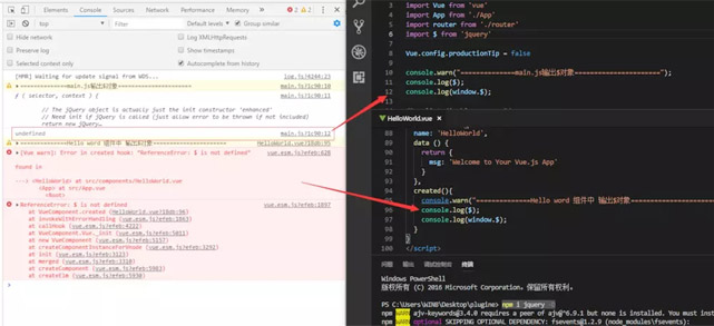 说明 此时我们会发现,main.js中我们引用了 jquery,$符号我们可以正常使用,但 window.$却不能,而且 helloWorld这个组件中也引用不到$;为什么呢?因为webpack是最后会把代码用闭包的方式打包,$对象并没有挂载在window下,helloWorld这个组件中并没有引用jquery所以它自然是拿不到的,那么怎么能做到在main.js中一次引用,每个组件都能拿到呢?