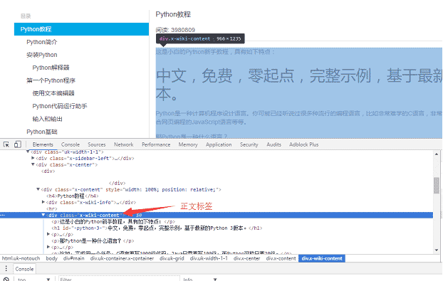 用 Chrome 浏览器找到页面正文部分的标签,按 F12 找到正文对应的 div 标签: <div >,该 div 是网页的正文内容。用 requests 把整个页面加载到本地后,就可以使用 beautifulsoup 操作 HTML 的 dom 元素 来提取正文内容了。