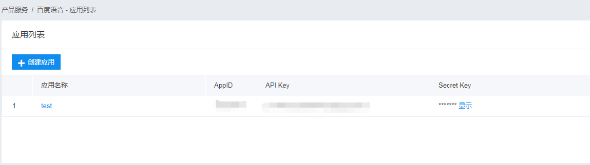 这里需要使用百度云,没有账号的需要先注册一下,然后搜索一下百度语音,再创建一个应用,如下: