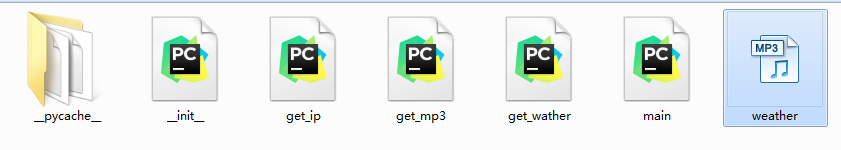这次有四个py文件:get_ip.py,get_wather.py,get_mp3.py和main.py。其中get_ip.py实现了获取本机ip地址和物理位置,get_wather.py实现了根据物理位置查询天气,get_mp3.py实现了调用百度语音API把文本转化成MP3文件,main.py是我们需要运行的py文件。这里由于查询天气用的是之前的方法,所以就不需要赘述了,主要说一下get_ip.py和get_mp3.py。