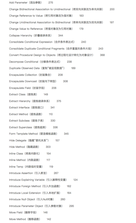 《重构》一书作者总结的重构手法实在是太多了,只能通过图片来展示一下所有作者总结的重构列表。 具体的补充,大家可以看看《重构》一书。